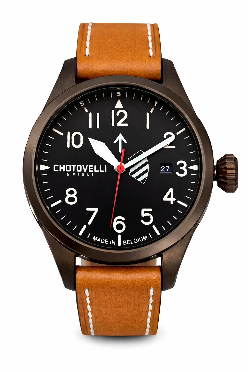 The Airbase Pilot, crafted in Belgium, is a commanding timepiece designed for maximum legibility. With its robust 47mm stainless steel case and anti-glare sapphire crystal, this watch is built to withstand the challenges of daily wear and the rigors of aviation. Its luminous Swiss indices ensure unparalleled clarity, even at high speeds in the air, making it the ultimate pilot’s companion.