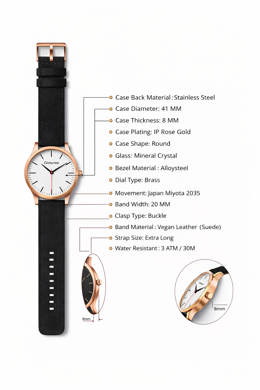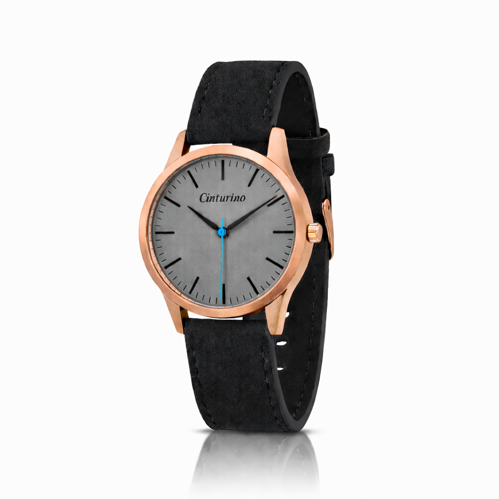 The most unique features in the Vantage collection is the hard brushed finish 41mm case that gives the feeling of a vintage timepiece . We sourced an animal friendly synthetic leather strap that has a suede like texture ,and together with the old-fashioned minute and hour hands it completes the overall look of the watch .